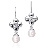 Symbolically lucky and aesthetically beautiful these earrings are a perfect choice for a Bridal ensemble. Bridesmaids will love these earrings. A trendy style you can wear with your casual everyday attire. The earrings are delicately crafted from .925 Sterling Silver, discreetly adorned with White Cubic Zirconia and embellished with 6mm Round Glowing Pearls. The Fish Hook Backs complete this elegant design. Dimensions: length 1 1/4 inches x width 3/8 inch and weighs 2.76gms. Comes with a 100% Money Back Guarantee, Gift Box and FREE SHIPPING.