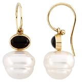 These are a ravishing pair of south sea cultured pearl and genuine onyx earrings. The earrings feature two baroque white cultured South Sea Pearls that are 5.0MM in diameter. The earrings also contain two natural oval black onxy that is bezel set in solid 14K yellow gold. These earrings securely fit to your ear with a french wire.