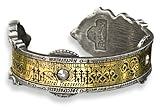 A great bracelet for steampunk enthusiasts. This fascinating adjustable cuff bracelet is etched with alchemical intricacies, Latin text, and mysterious English notations in antiqued lead-free pewter and solid brass. Cuff is 3/4" wide. Genuine Alchemy Gothic bracelet.