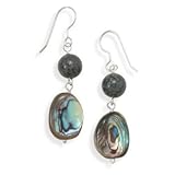 Sterling silver french wire drop earrings with 8mm kambaba jasper and 11mm x 15mm abalone shell. Search Phrases: sterling silver, 925, abalone, earrings, silver earrings, shell, nautical, silver,