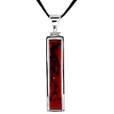 This sleek, linear pendant showcases a beautiful specimen of rich, earthy red jasper, a stone associated with confidence, courage, and protection. The reconstituted jasper stone is inlaid in rhodium-plated sterling silver. The rhodium plating prevents tarnishing and adds a gleaming finish.