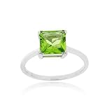 This classic solitaire ring features one genuine 7x7mm square peridot stone weighing 1.60ct. The stone is showcased in a sterling silver setting with high-quality rhodium plating for maximum shine and tarnish resistance.
