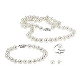 A timeless set that will become an heirloom for generations to come, the Sterling Silver White Freshwater Pearl Necklace Bracelet Earring and Ring Set presents timeless, lustrous pearls, perfect for any occasion. Round Chinese Freshwater Cultured Pearls harvested with medium luster and good to very-good uniformity create the 18-inch necklace. A double knot appears between each pearl, protecting the pearls surface or nacre. These same pearls appear on a 7.5-inch matching bracelet, as well as a classic pair of friction-back post earrings. Complete the look with a bypass ring design touched with a round white pearl in the center.