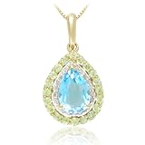 She'll love the luxurious combination of colors displayed along the Sterling Silver with 14k Yellow Gold Plated Swiss Blue Topaz, Peridot and Diamond Pendant. Resting from an 18-inch box chain is a magnificent teardrop shape formed by a bold natural blue topaz stone revealing vibrant sparkle. The stone is outlined by a double band of peridot and white diamond stones that are heat-treated to showcase wonderful shine. Although just .99-inches by 0.55-inches in size, this pendant will make a bold statement against a variety of fashions for any occasion.