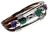 This great looking leather bracelet has 3 strands embellished with silver beads, and green and purple wrap accents. The bracelet is fully adjustable for 5 to 8 inch wrists... the two cords slide on the center knot. Simply pull to open and pull to adjust to desired fit; the center knot holds the cords closed. The cord ends are finish with silver beads. Arrives ready for gift giving in a silver linen foil gift box and a silver bow.