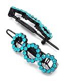 Here are two adorable black tone blue zircon rhinestone 3 circle metal snap hair clips. Each of the three circles is made of 11 sparkling crystals that will be the perfect accent to your hairstyle! Barrettes measure 1/2" wide and about 1 3/8" long. Comes with a foil box perfect for gift giving. Box may be different color than one shown.