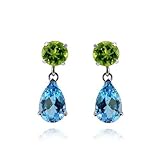 Golden-green peridot and Swiss blue topaz pair beautifully in these gemstone dangle earrings. Each earring holds a peridot round at the post, with a blue topaz pear dangling below. The faceted gemstones are mounted in gleaming 14 karat white gold, and the earrings are finished with classic friction backs. These earrings are a beautiful way to inject a little color into your wardrobe.