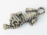 Designed in an antique-inspired old gold tone alloy metal, this brooch is a crouching tiger that is fully adorned with clear crystal rhinestones throughout its body. It is fierce and in position, ready to attack.
