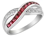 This stunning 2/3 carat (ctw) ring features a ribbon of created red ruby stones bending gracefully over a similar ribbon of round, brilliant cut white diamonds all claw set in 10 karat polished white gold. Eleven round, brilliant cut created ruby stones and ten glimmering white diamonds make up this lovely design. View item video above. SKU: 08CH0505CRUW:V4.5