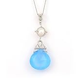 Blue chalcedony and white freshwater pearl are such a pretty combination. Add a sparkling diamond accent, and the beauty is complete. This elegant drop pendant is made from popular and durable 14 karat white gold and featured on a 17-inch light curb chain. The chalcedony stone has a pretty checkerboard faceted cut and a very soothing milky blue color.