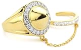 Chic with a touch of urban edge, the 18k Gold Wash Ring with Chain by Nicky Hilton is a unique piece that will turn heads. Made on a base of sturdy 925 sterling silver, the ring is plated with 18k gold for a warm, glossy finish. The ring top is cast in the shape of a domed spike edged with a row of tiny white cubic zirconia that sparkle in the light. Attached with a delicate gold-plated chain, a second ring features additional cubic zirconia on a narrow cuff band. Imprinted with the Nicky Hilton logo on the inside, the spike ring measures 17 millimeters high and 11 millimeters long. Let the chain dangle across the back of your hand for a look that is unusual and stylish.