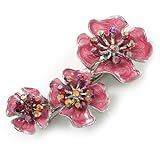 Enhance your favourite jacket with this sparkly Pink Enamel Diamante Flower Brooch. Featuring three graduated, pink coloured enamel flowers. The flowers joined together and accented with tiny fuchsia crystals for a hint of subtle sparkle. The pin measures about 6cm x 2.5cm and it secures with a bar and swivel clasp fastener.