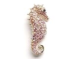An adorable fashion jewelry piece, this piece features rose pink aurora borealis crystal rhinestones throughout the seahorse, golden tone plated metal base with a safe pin closure. Three aurora borealis irridescent rhinstone strips are embedded along on its body. An additional ring loop is added to attach a chain and convert this brooch to an eye-catching necklace pendant.