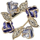 This adorable rose ring is constructed with a wreath of cute rose buds decorated with authentic Austrian crystals. This brooch measures 1.6 inches long by 1.6 inches wide and weighs 20 grams. The brooch has a heart-shaped snap clasp with a back pin on the side. This cute brooch will add a sparkling flair to your jacket lapel or scarf. Available in 3 colors: Blue, Gold, Pink.