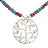 The ever-popular Tree of Life in sterling silver is complemented with deep red ruby and vivid blue apatite beads in this hand crafted necklace. Made in the USA by Siennalynn Designs exclusively for Taos Trading. Deep jewel tone gemstones are the perfect combination with the bright silver 'rock beads' and beautiful Tree of Life Pendant. Rubies are the traditional birthstone of July, and a token of love. Apatite is thought to bring great spiritual awareness to the wearer. The tree of life is a powerful, life-affirming symbol. It represents all that is true, wholesome, stable, and noble. When you are in need of stability and strength in your life - envision the tree of life in your minds eye. A dazzling piece of jewelry! The sterling tree of life measures 1 1/8" in diameter and the 16 1/2" necklace is finished with a toggle clasp. See our Taos Trading storefront for a great selection of jewelry designs and styles.