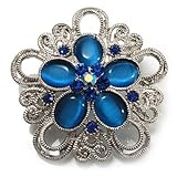 Glitzy, glamorous and perfect for the fashion conscious woman who just loves to accessorize. Featuring a rhodium plated filigree floral design, encrusted with shimmering navy blue crystals and five oval cat eye stones, providing a fabulous finish. The brooch measures about 4.5cm in diameter and fastens with a flag pin and revolver clasp.