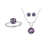 This jewelry set showcases a solitaire pendant, ring and a matching pair of stud earrings. They all feature round amethyst stones for which the pendant measures 7mm, the ring 7mm and the stud earrings 5mm. The pendant dangles from an 18-inch rolo chain and the earrings are secured by post and friction backs. All three jewelry pieces are crafted of polished sterling silver. Wear them together or individually, match it to the occasion! Total gem weight: 3.6ct.