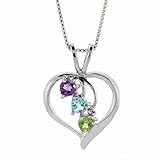 Amethyst is a stone of peace, love, and healing. Peridot is thought to reduce stress encourage personal growth and banish laziness, and inspire healing and growth.The beautiful blue topaz stone inspires leadership ability, spiritual growth, and tranquility. Heart shaped genuine peridot, amethyst, and blue topaz stone hang in a delicate deisgn accented by a sparkling genuine diamond accent in the center of this precious heart pendant.