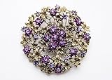 This brooch is designed in an antique-inspired gold-tone metal. It features an array of amethyst purple crystal rhinestones and also intricate metal details. The flower is arranged in a semi-sunburst fashion and is very elegant!