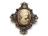 The pin brooch is as breathtaking as the maid cameo embedded on it. The smoked topaz rhinestones, the vintage finish metal, and the beads match perfectly to create a masterpiece. One ring attached to the back convert this brooch dual functional as a necklace pendant. Simply irresistible.