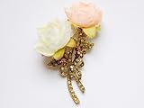 Intricately made, this brooch features two beautiful roses made from cloth, in the colors cream and peach. The leaves and the stems of these roses are made with light peach and topaz crystal rhinestones. This brooch is the definition of elegance and it combines the beautiful of crystal rhinestones and cloth design.