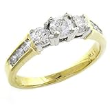 Show her how she dazzles you. This beautiful three stone diamond ring is elegantly accentuated by rows of round accent diamonds flowing gorgeously down a complementary setting of warm yellow and white gold. This ring has nine round diamonds for a total weight of 1.00 carat. The diamonds are color H-I and clarity I2. Available in size 7 only. An amazing value! Netaya Style# 4AN2T83D/07