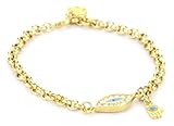 Classy and unique, the Blee Inara Enamel and Swarovski Eye Chain Bracelet adds a hint of high fashion to your day and evening wear. The delicate bracelet is crafted from 18k gold-plated base metal for a bright shine that will complement all your favorite pieces. A single strand of rolo chain wraps around the wrist with a curved eye-shaped charm at the middle. Decorated with clear Swarovski crystals, the eye is accented with a bright turquoise enamel center. A tiny hamsa palm charm dangles next to the eye with matching turquoise enamel for a pop of color. Fastening with a lobster-claw clasp, this lightweight bracelet measures 6.5 inches long for an ideal fit on most wrists.