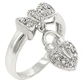 This CZ fashion ring features a pave set CZ heart lock dangling from a CZ ribbon bow all in Silvertone. Tell her your heart is locked up for her. Silvertone is achieved using an electroplating process that coats the item with heavy layers of rhodium, a close cousin of platinum, that gives our jewelry a platinum luster.