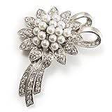 Accessorize to impress with this magnificent Delicate Faux Pearl Bridal Floral Brooch (Silver Tone). Featuring a floral motif, crafted in shiny rhodium plated finish and decorated with sparkling clear crystals and snow white faux pearls. The brooch measures about 55mm x 35mm and fastens with a flag pin and revolver clasp.