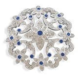 Open work flower design fashion bar pin has blue and clear genuine Swarovski crystals. Nickel-free and lead-free base metal is plated with high quality fine silver.