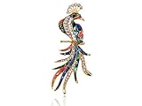 Perched on a tree branch the curvaceous phoenix pin brooch looks appealingly colorful. There are many colors but they are not loud. The clear crystal rhinestones provide a soothing contrast to the polished natural abalone shell pieces on the colorful enamel, compose the beauty of the feathers.