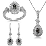 Revealing modern sparkle and art-deco influenced style, the Sterling Silver Black and White Diamond Ring, Pendant and Earrings Box Set is full of eye-catching detailing, making it a wonderful gift. The pendant rests from an 18-inch rolo chain and shows off a teardrop shape of black diamond stones outlined by a white diamond and roped 925 sterling silver trim. Finished with swirling detailing along the sides, this pendant captures all attention to detail. This same teardrop design is matched on a pair of friction-back drop earrings and along the top of a size 6 ring.