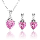 A colorful gemstone set that models her pretty-in-pink style, the Sterling Silver Created Pink Sapphire and Diamond Heart Earring and Pendant Set makes a wonderful gift. A bright heart-shaped created pink sapphire stones sit in a twisting basket of 925 sterling silver. Touched right above is a small natural round diamond for an extra touch of sparkle along an 18-inch cable chain. This same design is showcased on a pair of sparkling friction-back post drop stud earrings.