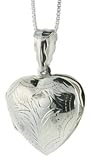 This is a Sterling Silver Heart Shape Locket. It's Hand Engraved on both sides and even on the bail, and polished in the inside. The quality is excellent. This Locket is slightly smaller than a Nickel about 13/16" wide by 13/16 inch high not including the bail. The chain is sold separately.