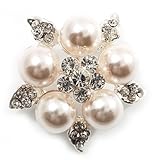Endless glamour. This Stunning Bridal Pearl Crystal Brooch is simply spectacular. Featuring a flower design, made of five 11mm white faux pearls, set in silver tone frame and decorated with clear crystals for a dazzling look. The flower pin measures around 40mm in diametaer and secures with a flag and revolver fastener.