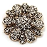 Treat yourself to the transformational beauty of this stunning Vintage Crystal Floral Brooch. The dimensional, blossom design's petals set with shimmering round cut Swarovski clear crystals, offering a dazzling finish. The brooch crafted in antique gold finish, measures about 42mm x 42mm and secures with a flag and revolver fastener.