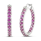 The colorful Sterling Silver Created Pink Sapphire Hoop Earrings feature a standard hoop shape embellished with loads of pizzazz. The surface of the sterling silver hoop earrings is inset with synthetic pink sapphires in four-prong settings. The pink stones have a total of 3.6 carats and provide plenty of sparkle with a pop of color. The earrings are almost 1 inch in diameter and make a fun statement in your ears. They are secured with lever-back clasps that are easy to put on and take off.