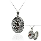 This classic oval locket features a filigree design, studded with shimmering marcasite stones. Nestled in its center is an oval-cut genuine garnet stone.